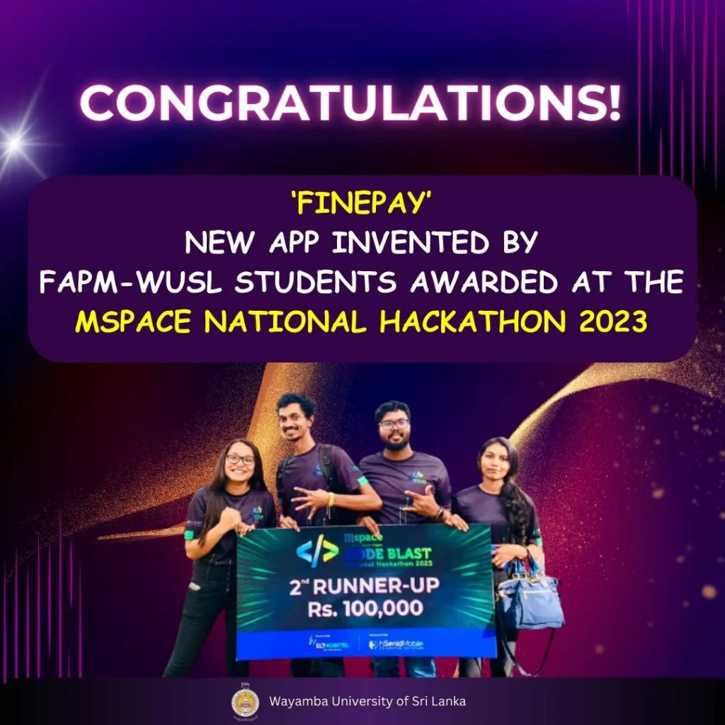 Our Faculty undergraduates secured second runner-up at Mspace National Hackathon 2023 organized by SLT Mobitel, competing against 170 projects. Led by M.A.M. Akeel Shahan, (BT) and supported by co-founders Iresha Perera (ABM) and Nethmini Wijendrasinghe (BT) , showcased “FinePay,” an innovative traffic fine management app. This accomplishment underscores their interdisciplinary approach and the potential for innovation in diverse domains.