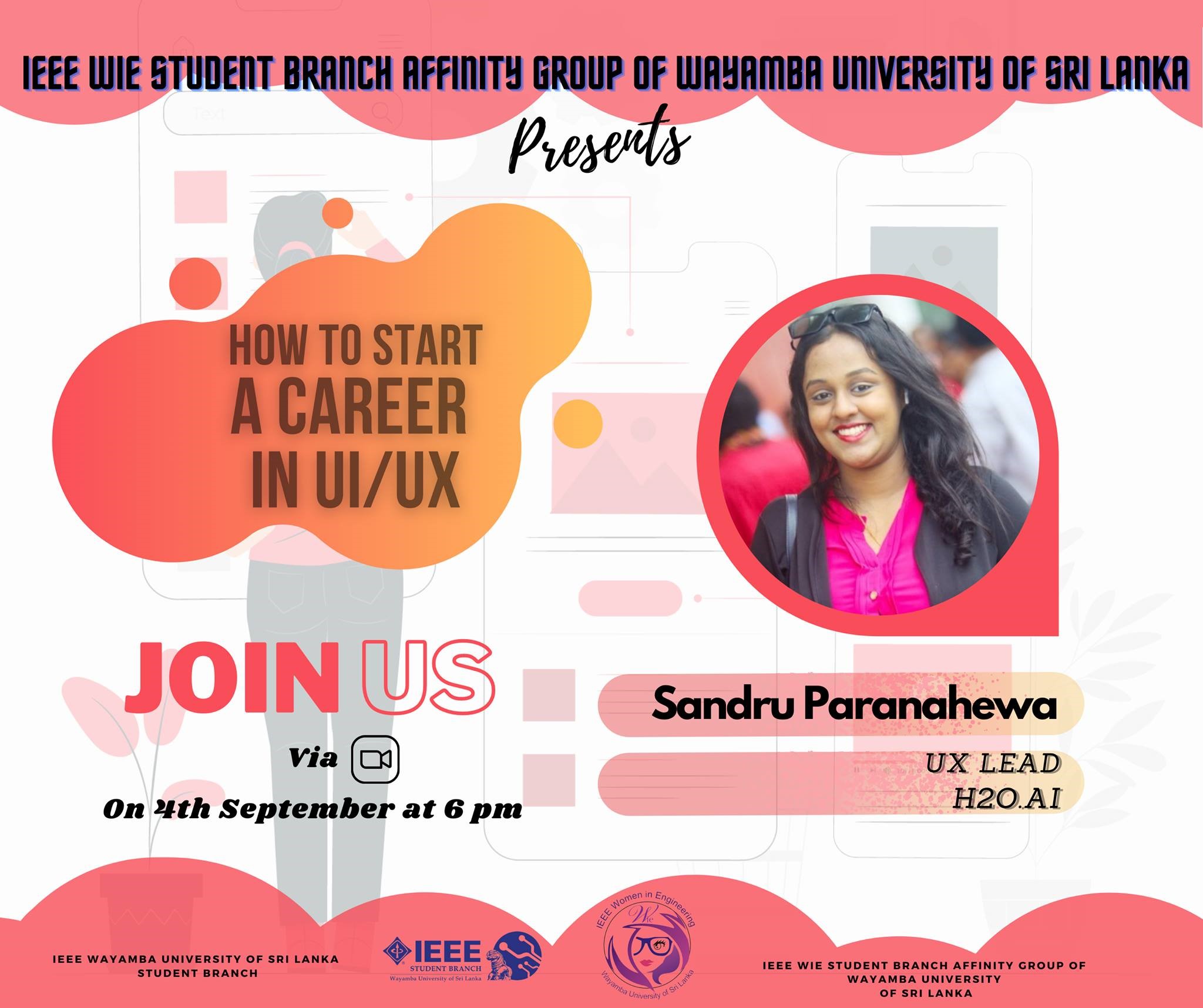 This was a beneficial webinar organized by the IEEE WIE Student Branch of Wayamba University of Sri Lanka for people who are eager to start their UI/UX careers and get the maximum out of their potential. This webinar focused on those who are willing to start the UI/UX journey in Sri Lanka. The audience consisted of undergraduates, UI/UX enthusiasts, and school leavers. This was held successfully on 4th September 2021 at 6:00 pm. This webinar was held on the Zoom platform with the participation of more than 200 participants. The main intention was to guide newbies to go higher in the UI/UX career from their first step onwards. We needed to bring in an experienced speaker to motivate the students in order to address this interesting topic.