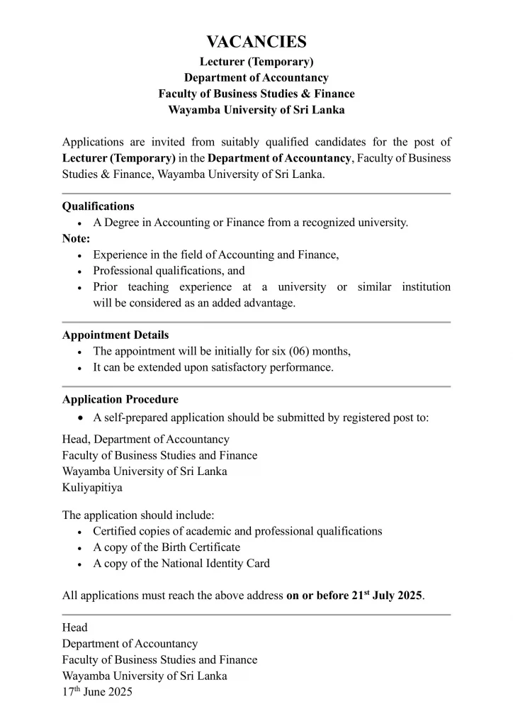 Lecturer (Temporary) – Department of Accountancy Faculty of Business Studies & Finance