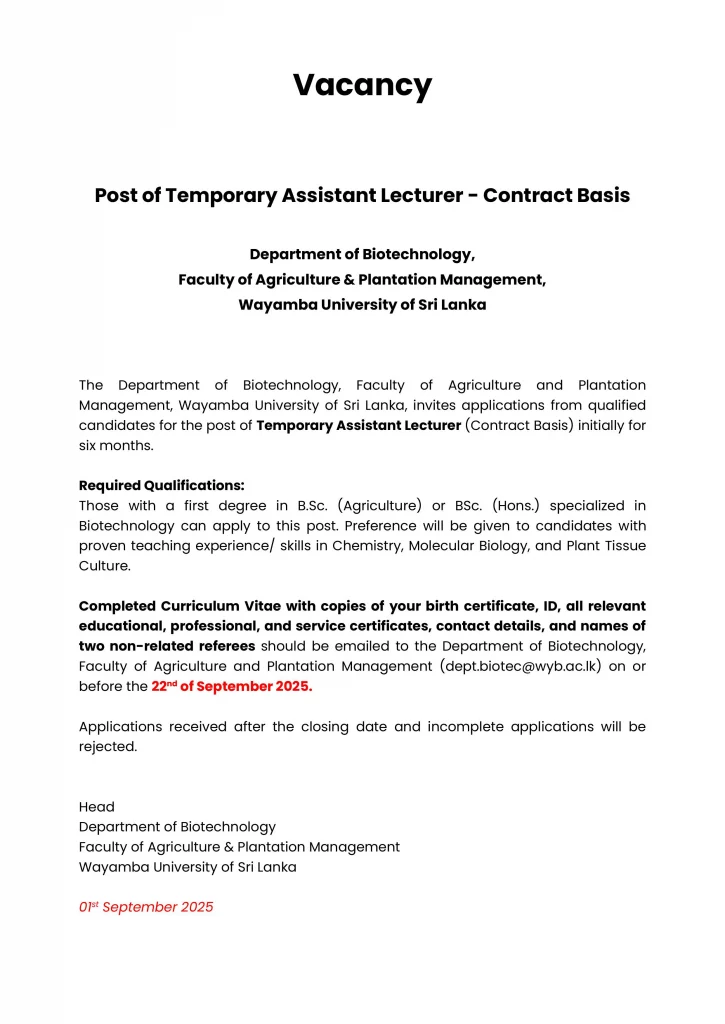 Temporary Assistant Lecturer & Temporary Demonstrator Vacancies in Electronics