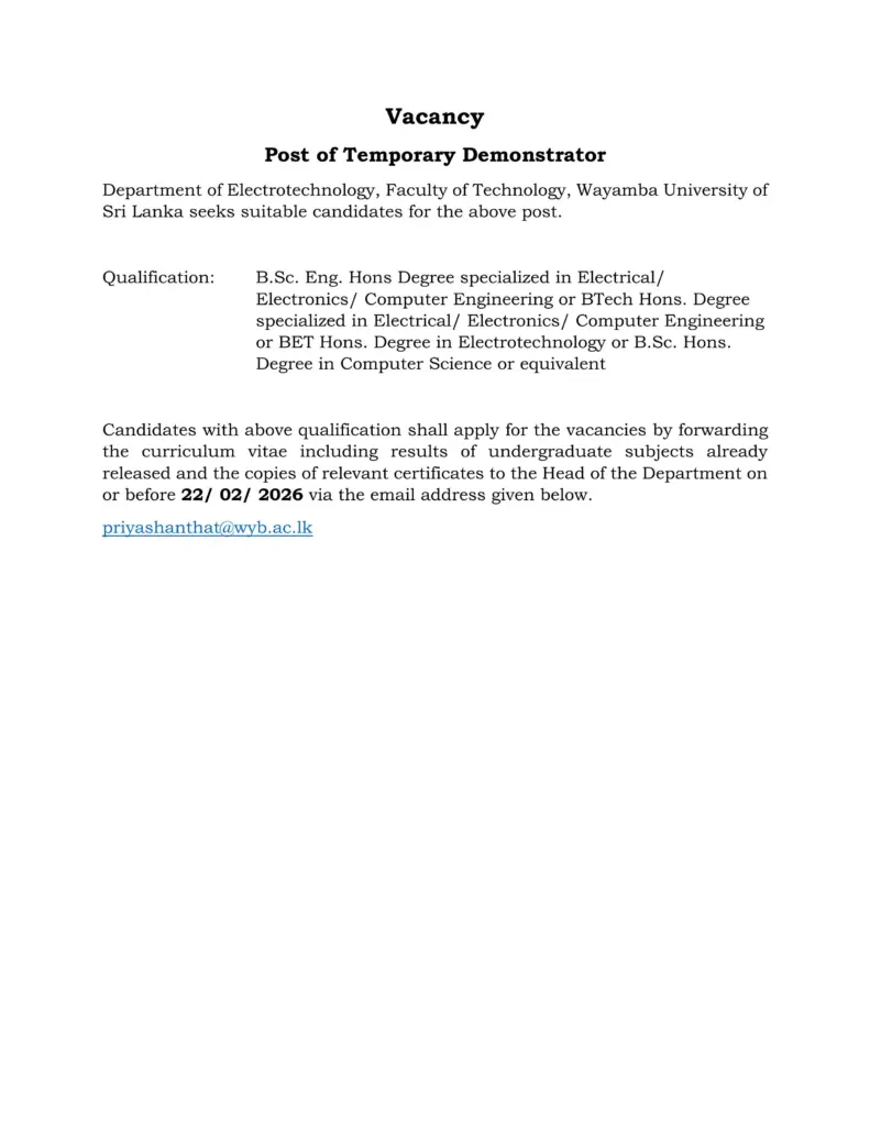 Post of Temporary Demonstrator – Department of Electrotechnology