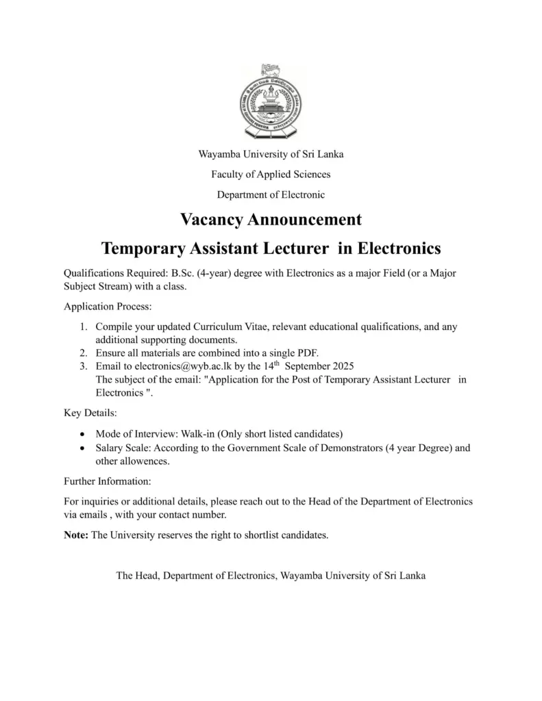 Temporary Assistant Lecturer & Temporary Demonstrator Vacancies in Electronics